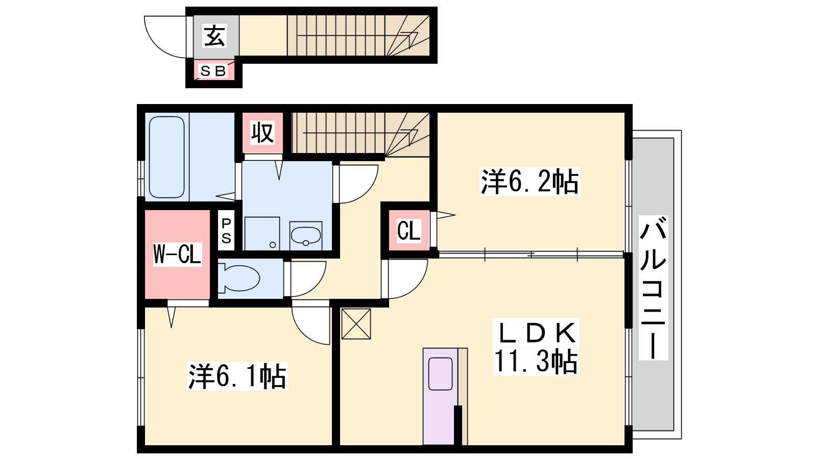 - LDK11.3帖、洋室6.2帖、洋室6.1帖