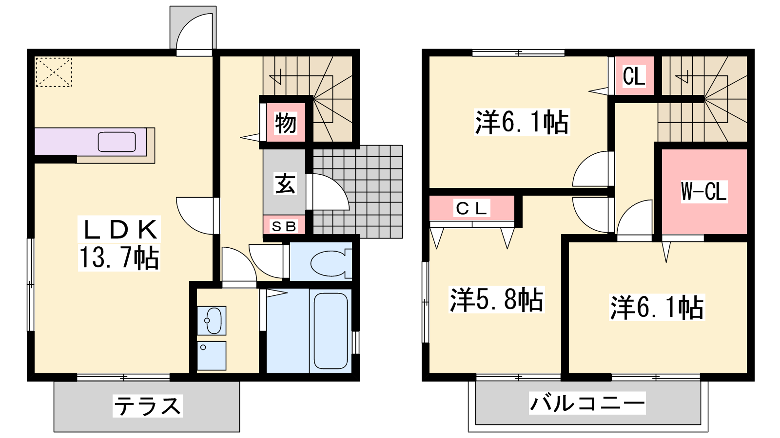 - LDK13.7帖、洋室6.1帖、洋室6.1帖、洋室5.8帖