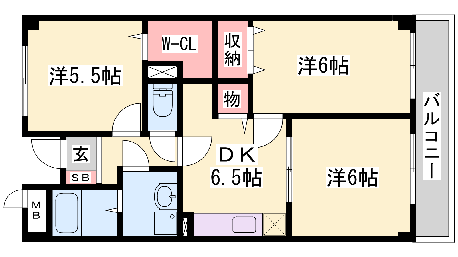 - DK6.5帖、洋室6帖、洋室6帖、和室5.5帖