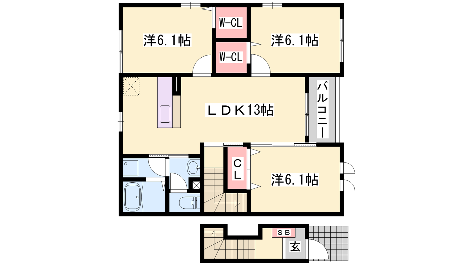 - LDK13帖、洋室6.1帖、洋室6.1帖、洋室6.1帖