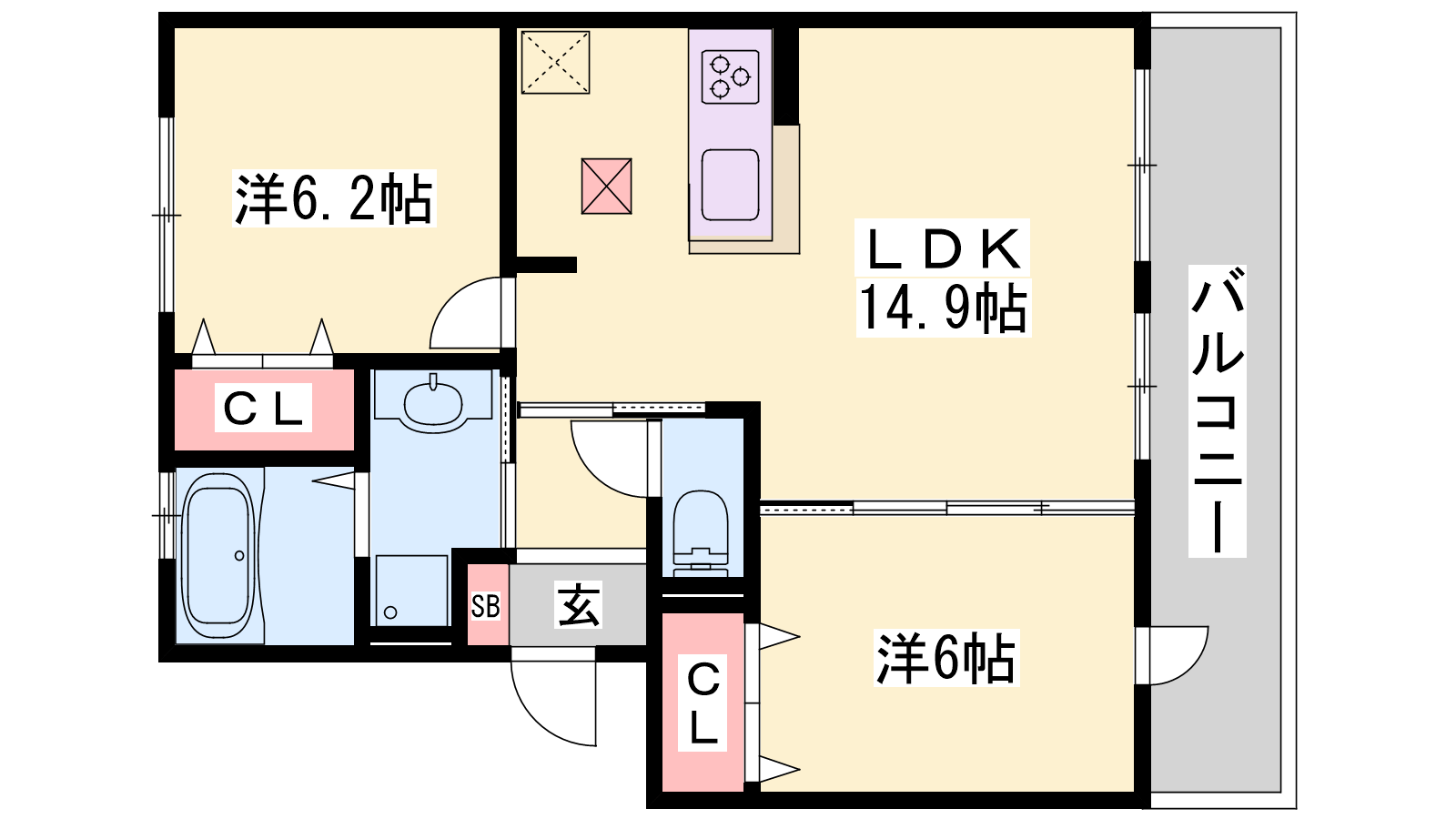 - LDK14.9帖、洋室6.2帖、洋室6帖