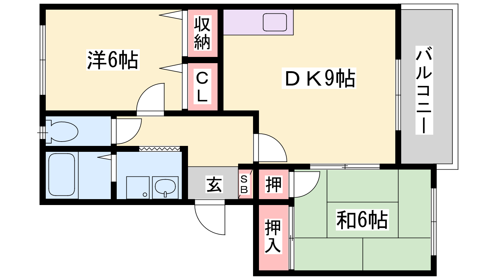 - LDK9帖、洋室6帖、和室6帖