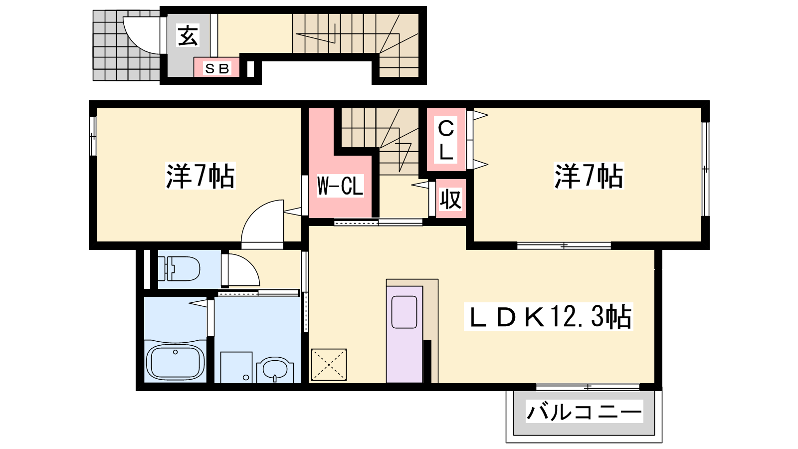 - LDK12.3帖、洋室7帖、洋室7帖