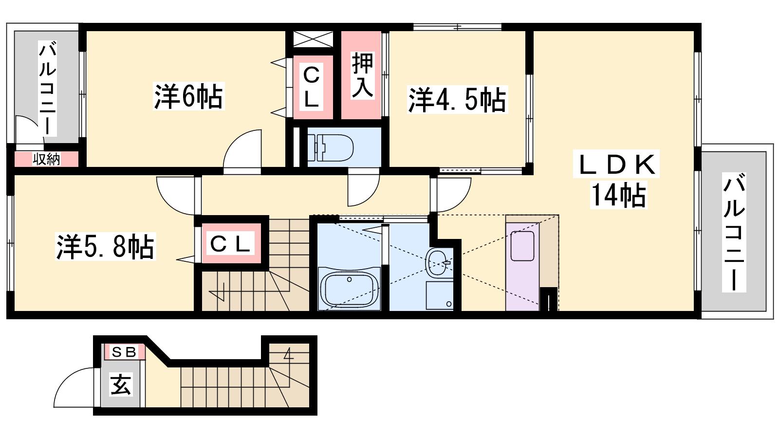 - LDK14帖、洋室6帖、洋室5.8帖、洋室4.5帖