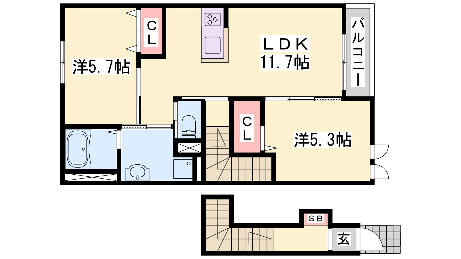 - LDK11.7帖、洋室5.7帖、洋室5.3帖