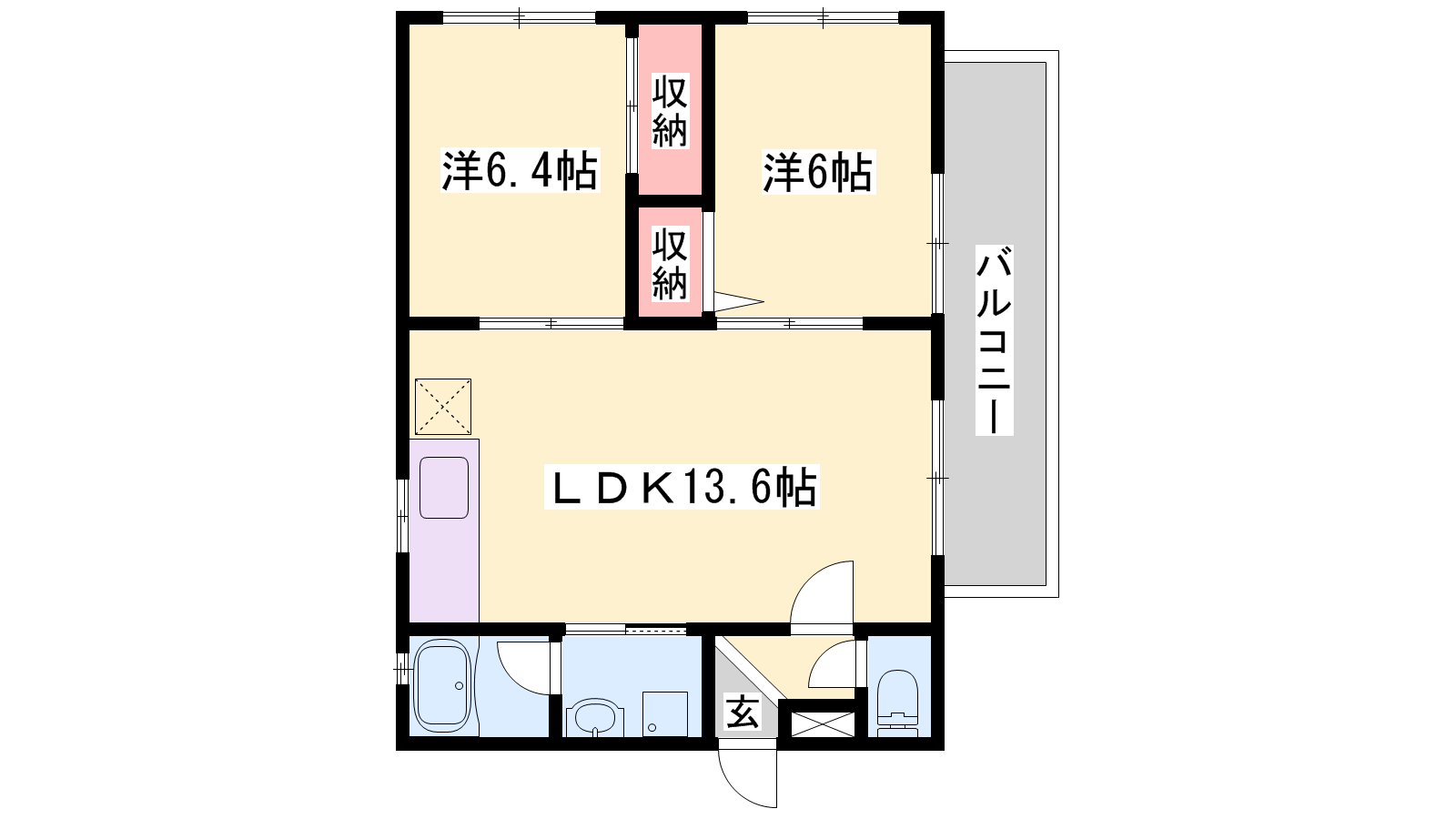 - LDK13.6帖、洋室6.4帖、洋室6帖
