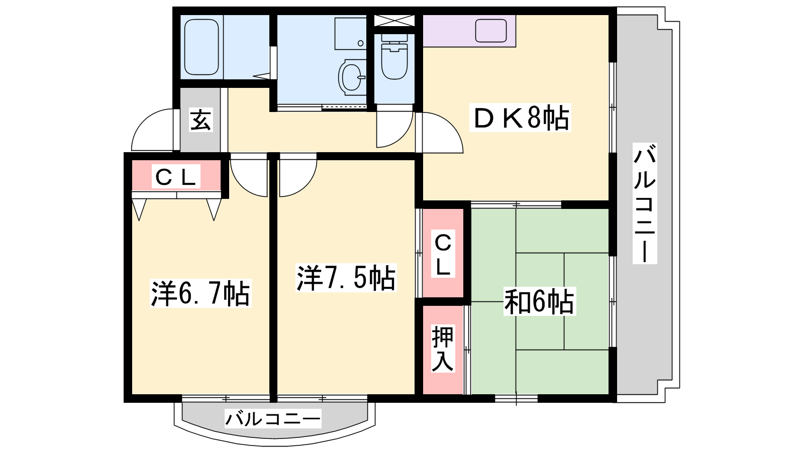 - LDK8帖、洋室7.5帖、洋室6.7帖、和室6帖