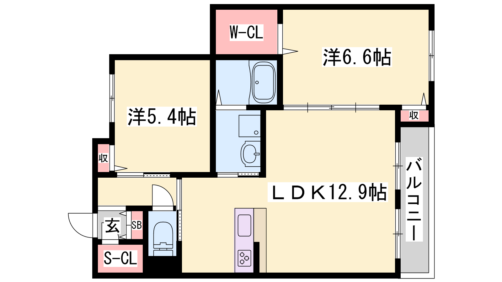 - LDK12.9帖、洋室6.6帖、洋室5.4帖