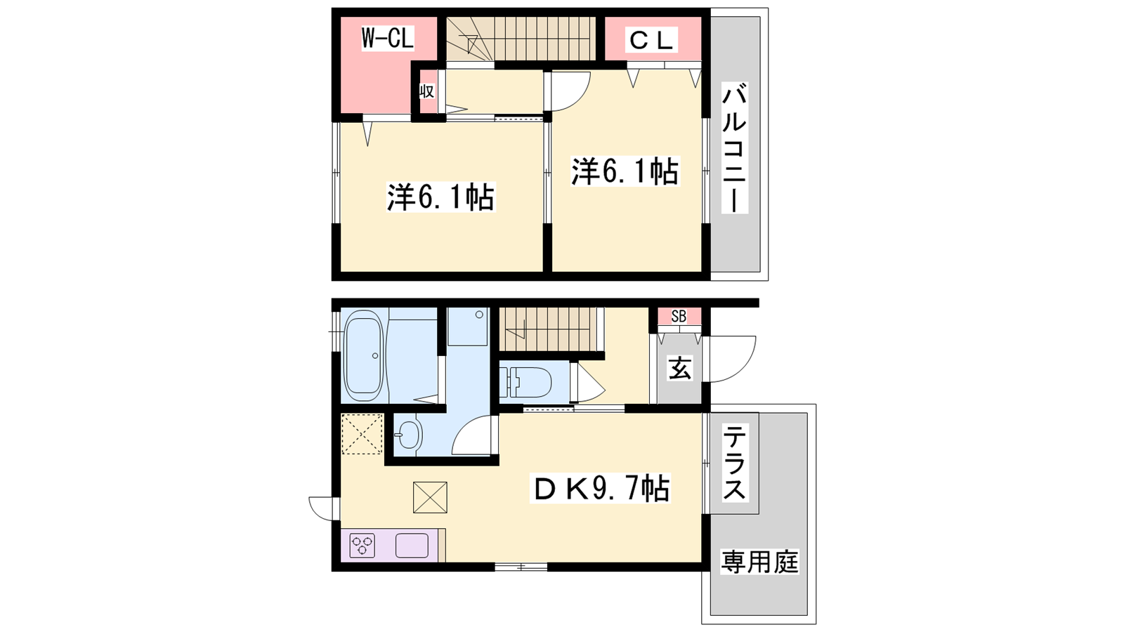 - DK9.7帖、洋室6.1帖、洋室6.1帖