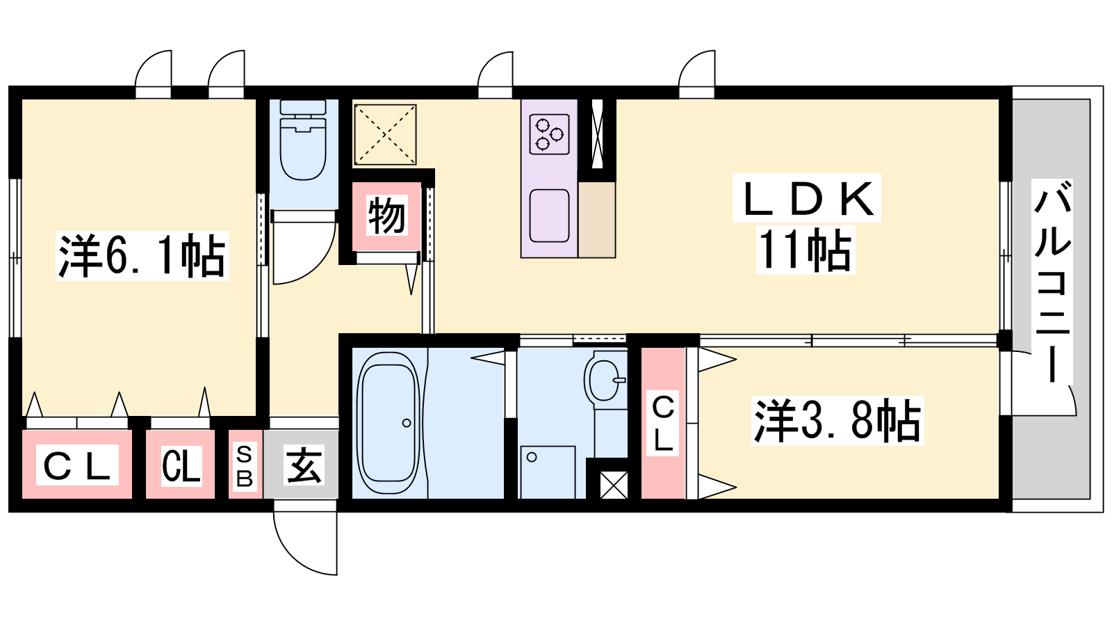 - LDK11帖、洋室6.1帖、洋室3.8帖