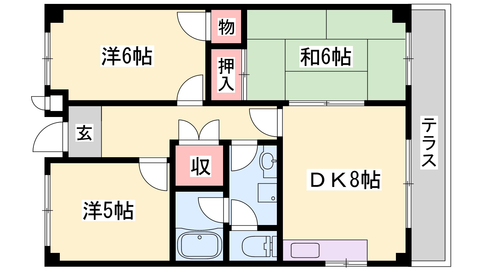 - LDK8帖、洋室6帖、洋室5帖、和室6帖