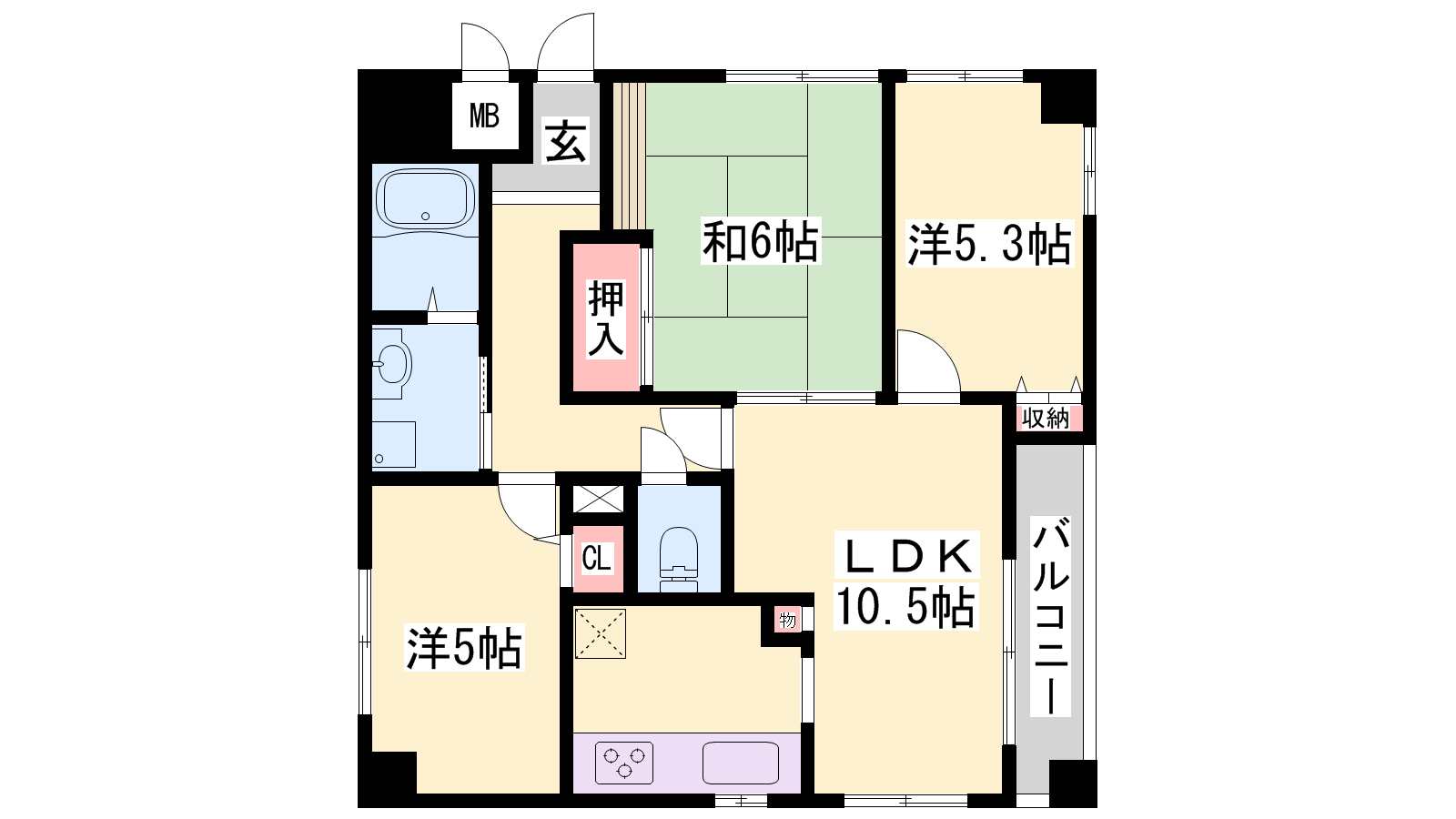- LDK10.3帖、洋室5.3帖、洋室5.2帖、和室6帖