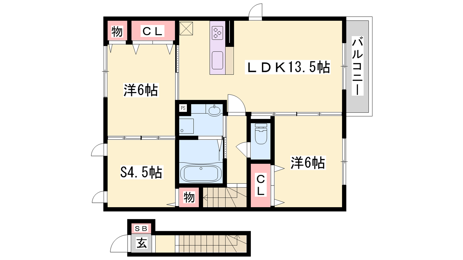 - LDK13.5帖、洋室6帖、洋室6帖、S4.5帖