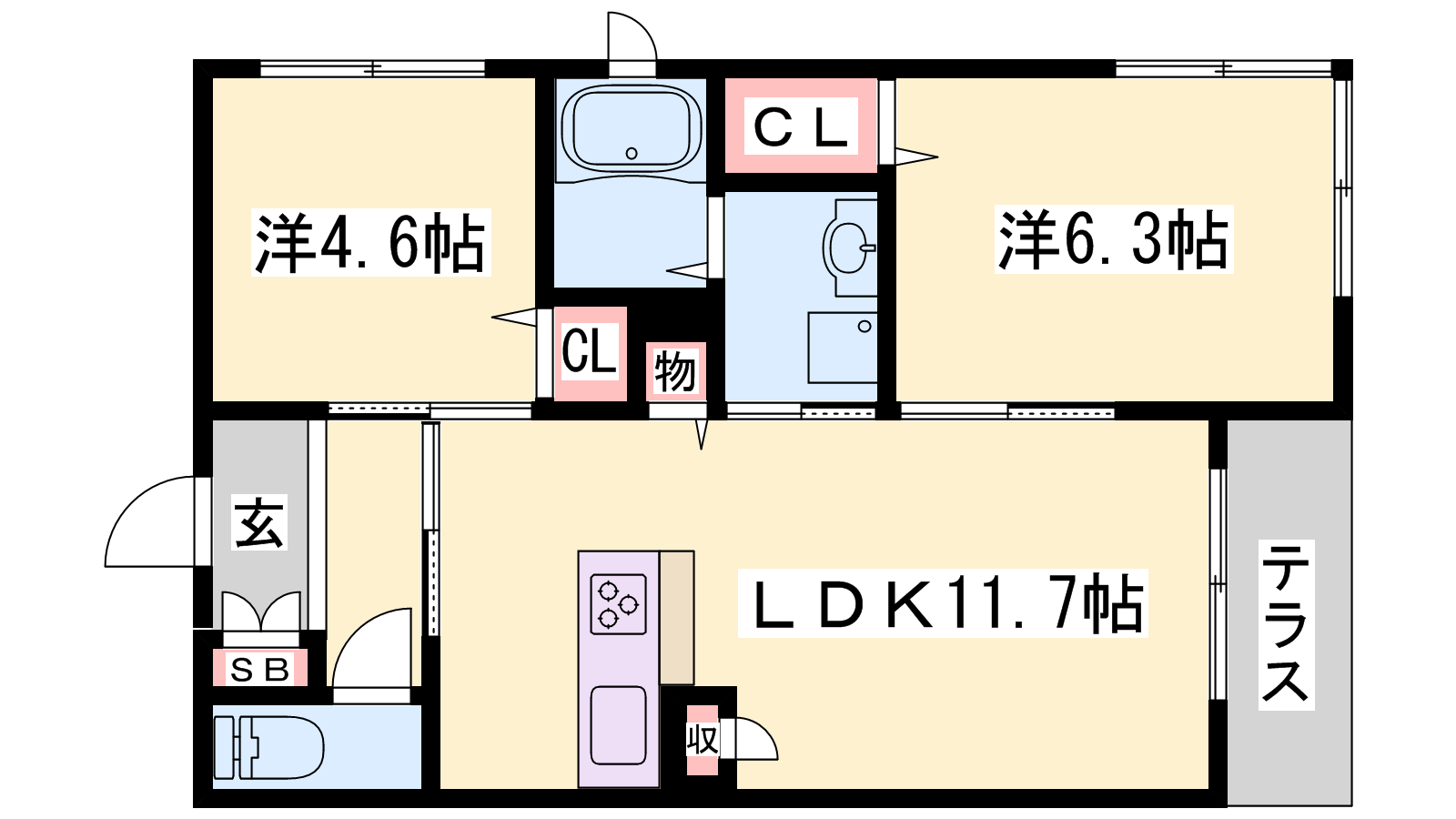 - LDK11.7帖、洋室6.3帖、洋室4.6帖