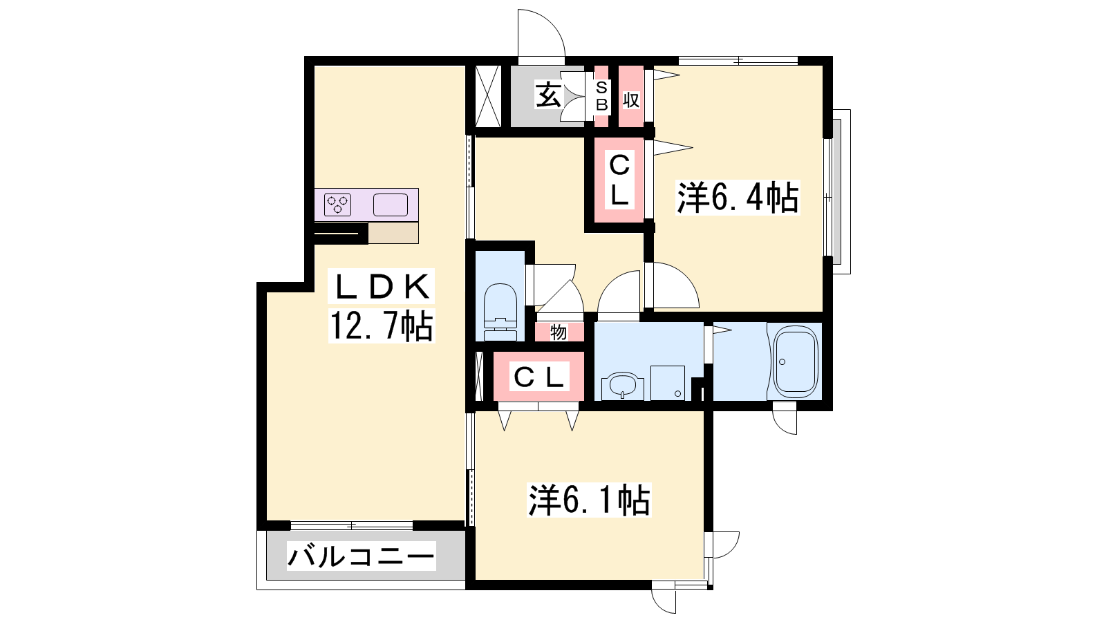 - LDK12.7帖、洋室6.4帖、洋室6.1帖