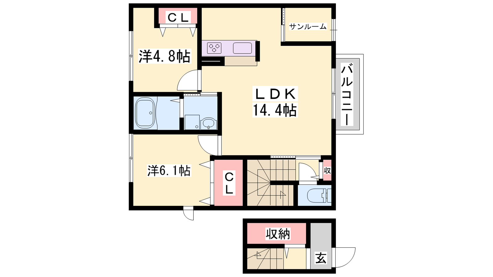 - LDK14.4帖、洋室6.1帖、洋室4.8帖