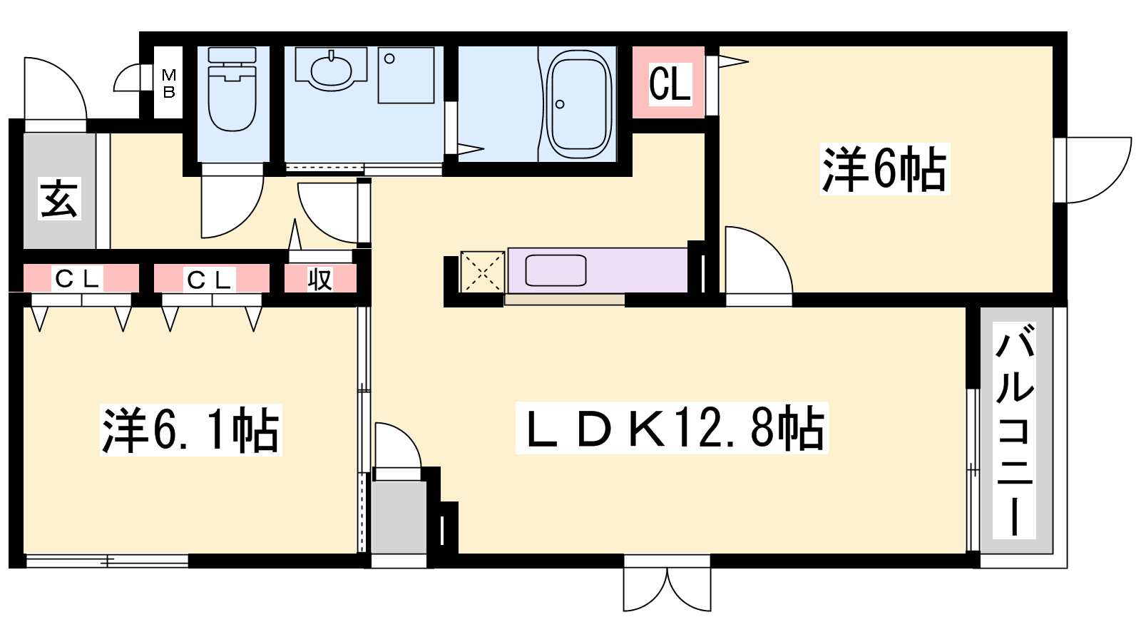 - LDK12.8帖、洋室6.1帖、洋室6帖