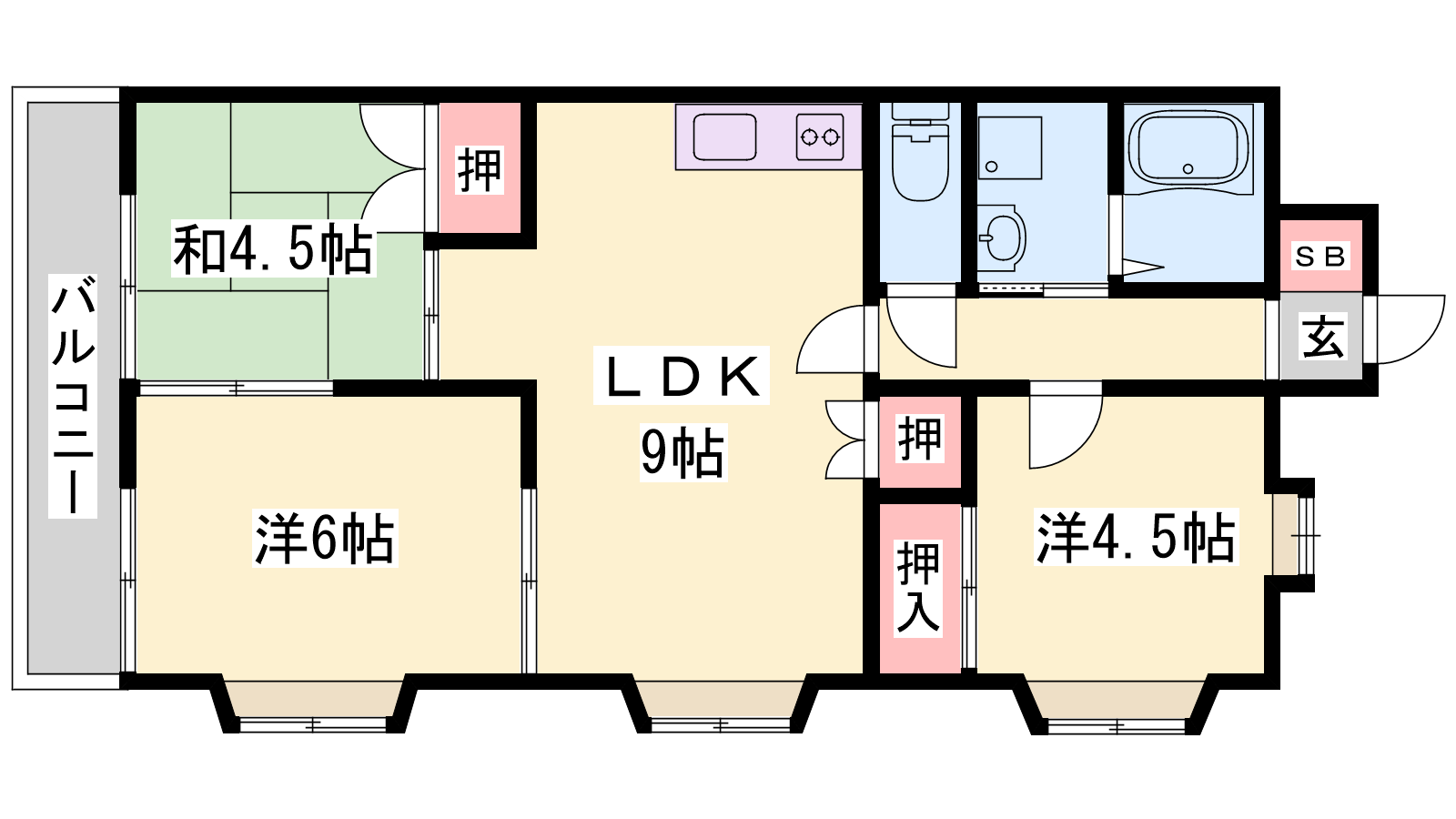 - LDK9帖、和室6帖、洋室4.5帖、和室4.5帖