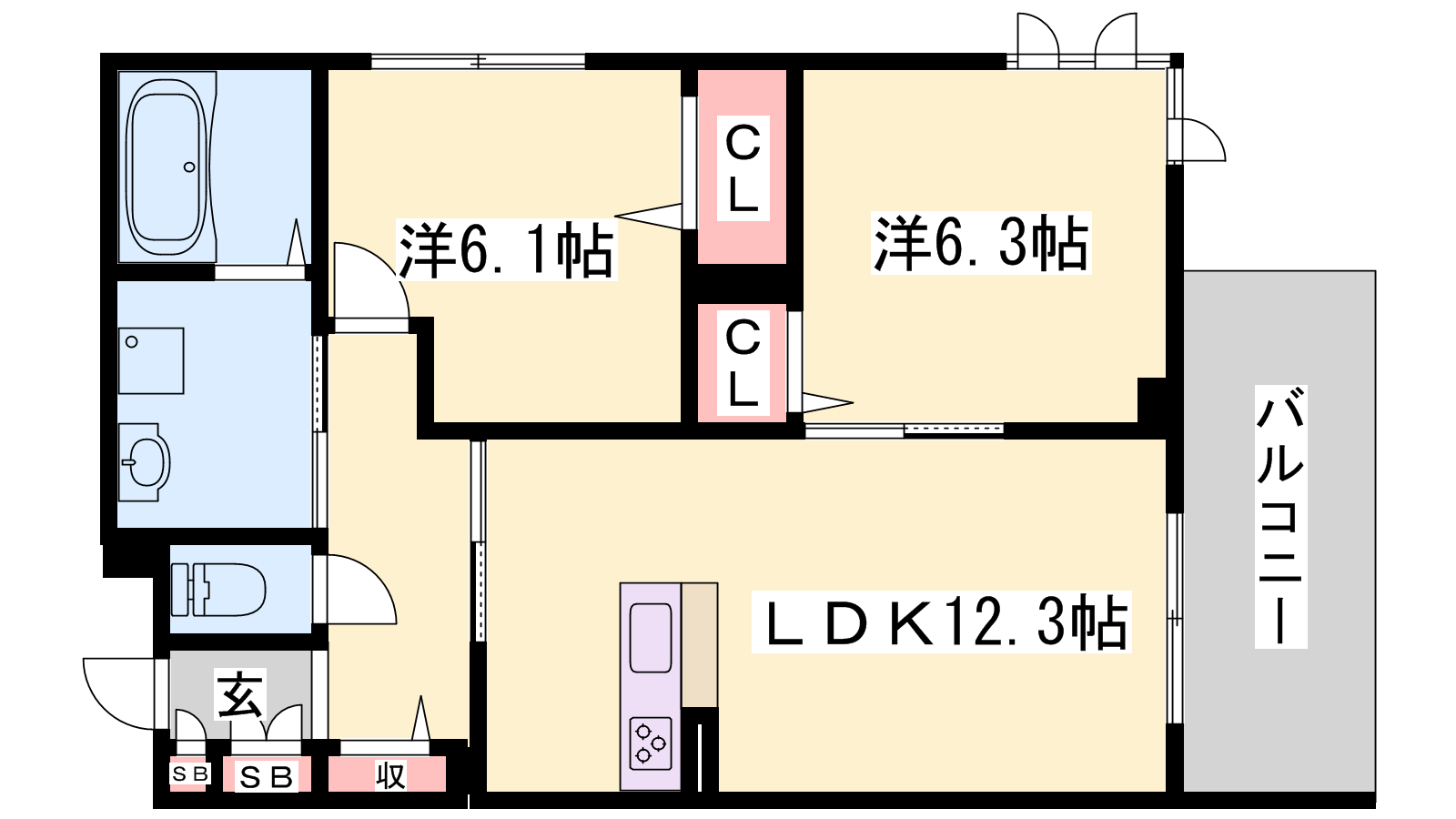 - LDK12.3帖、洋室6.3帖、洋室6.1帖