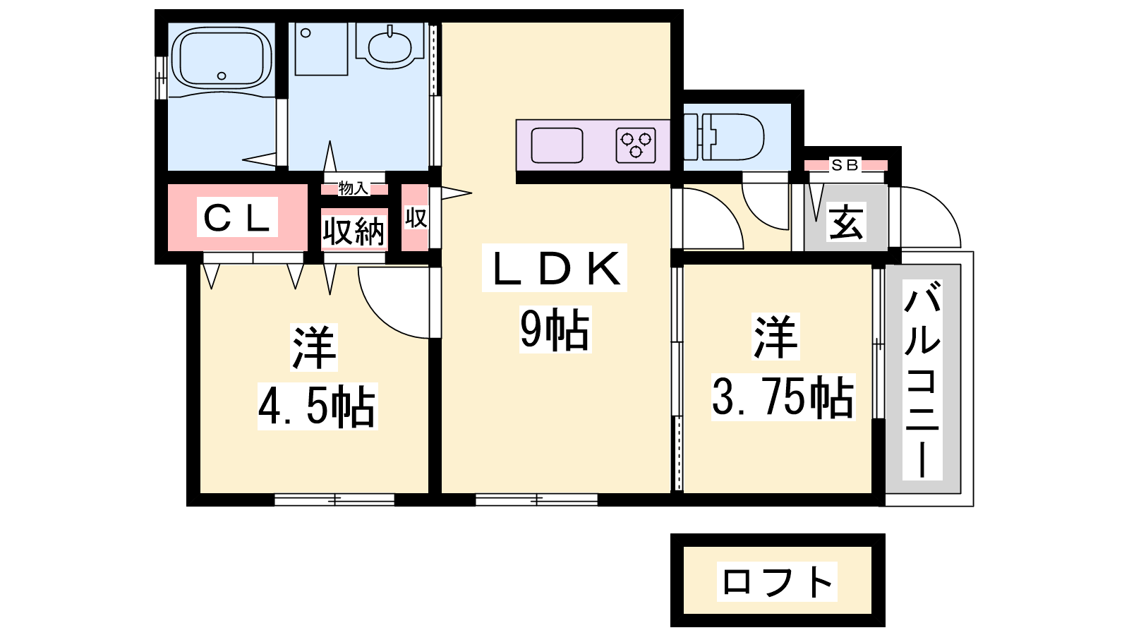 - LDK9帖、洋室4.5帖、洋室3.75帖