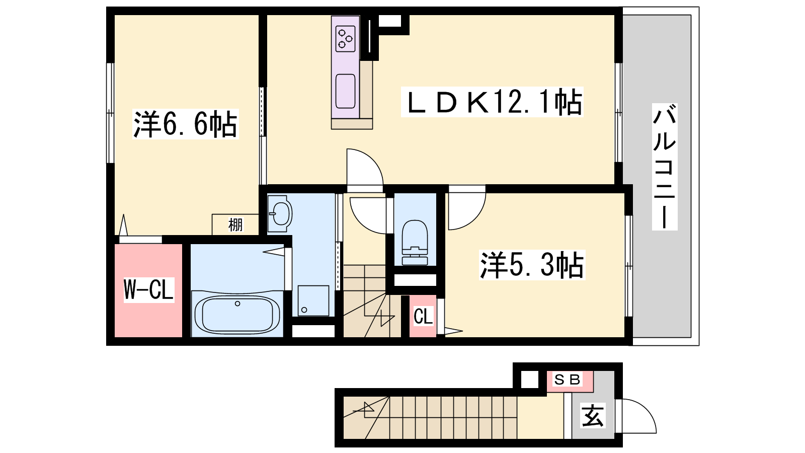 - LDK12.1帖、洋室6.6帖、洋室5.3帖