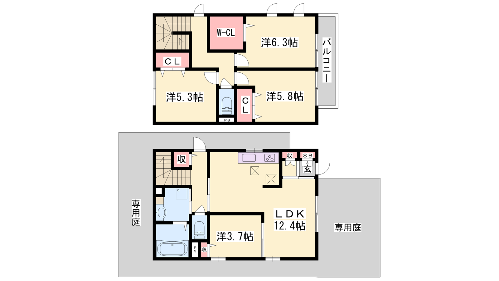 - LDK12.4帖、洋室6.3帖、洋室5.8帖、洋室5.3帖、洋室3.7帖
