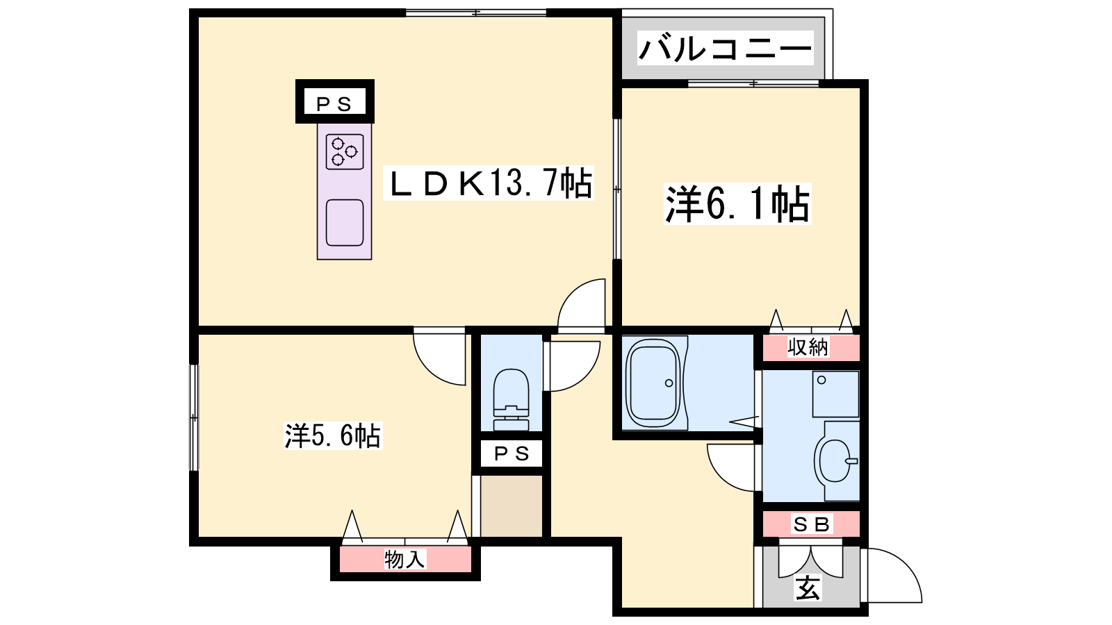 - LDK13.7帖、洋室6.1帖、洋室5.6帖