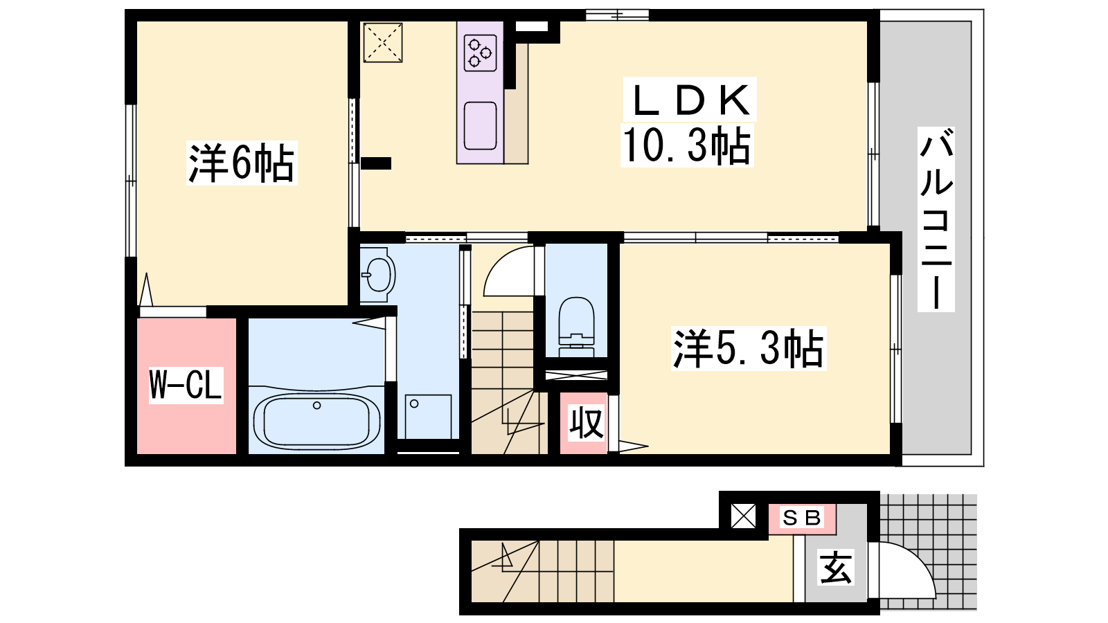 - LDK10.3帖、洋室6帖、洋室5.3帖