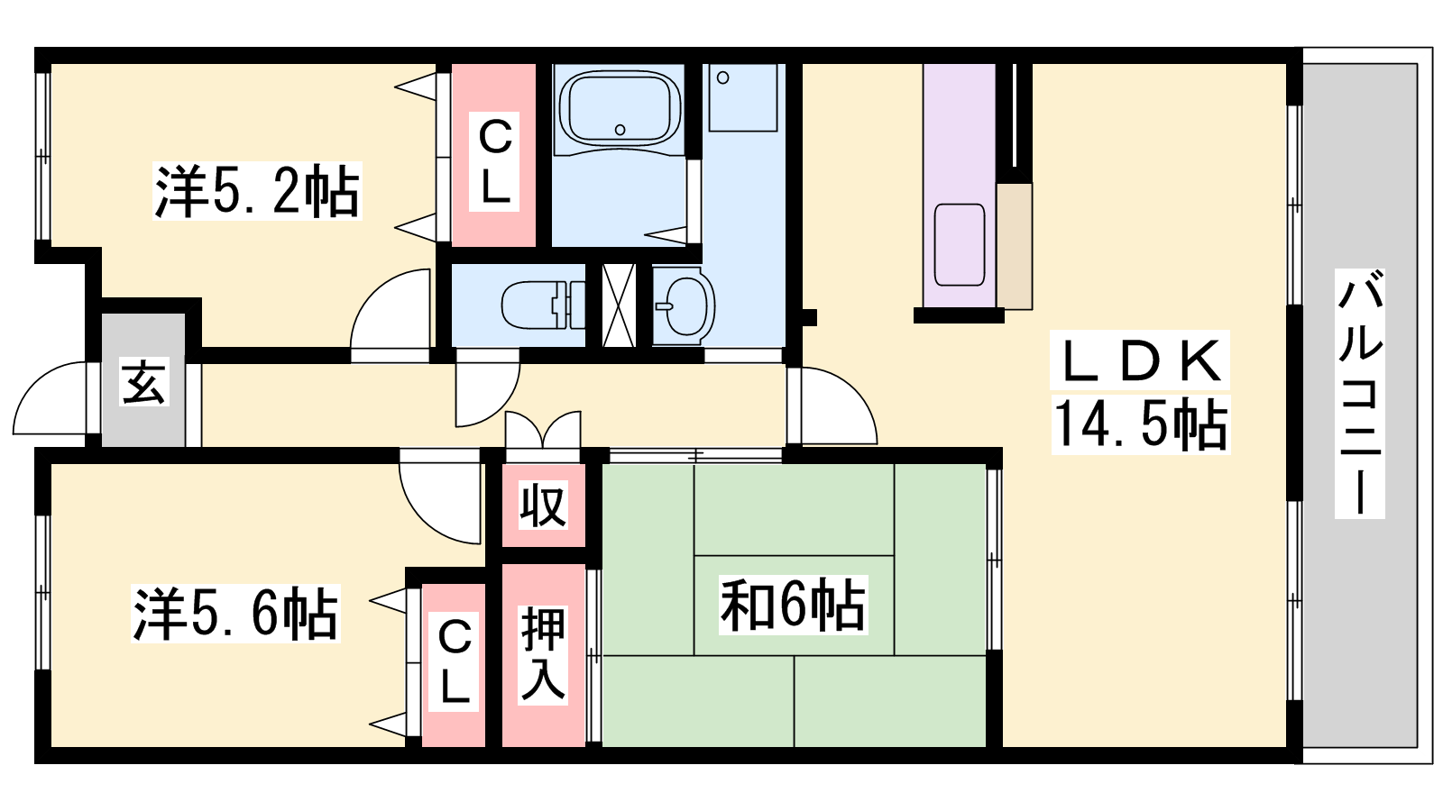 - LDK14.5帖、洋室5.6帖、洋室5.2帖、和室6帖
