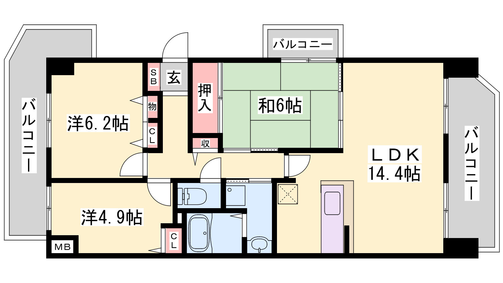 - LDK14.4帖、和室6帖、洋室6.2帖、洋室4.9帖