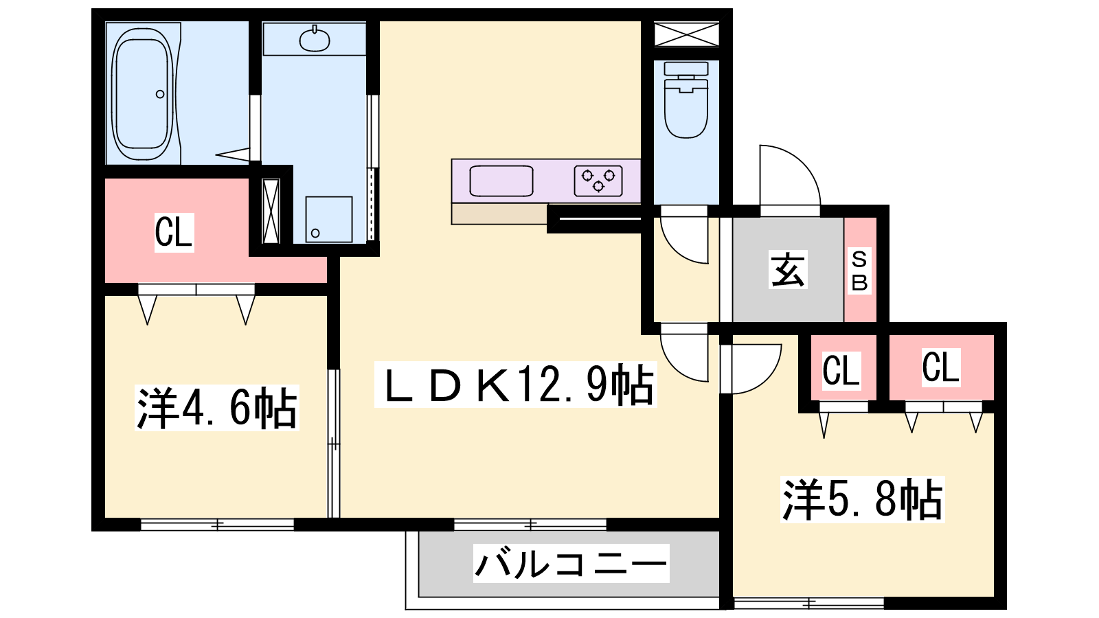 - LDK12.9帖、洋室5.8帖、洋室4.6帖