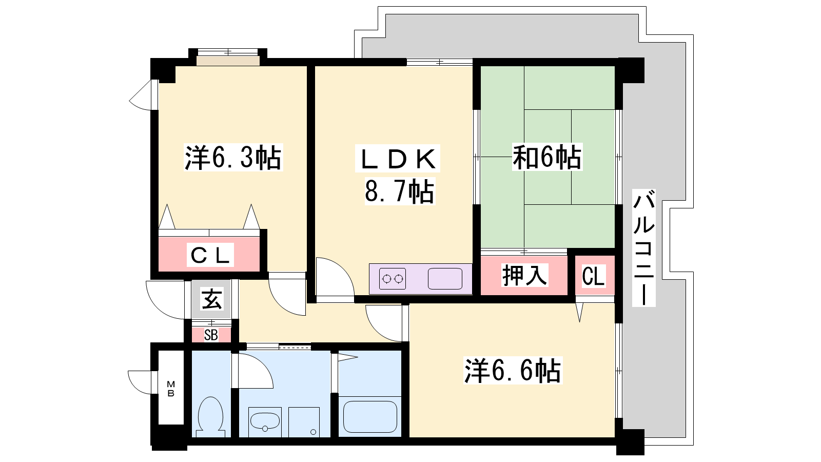 - LDK8.7帖、洋室6.6帖、洋室6.3帖、和室6帖