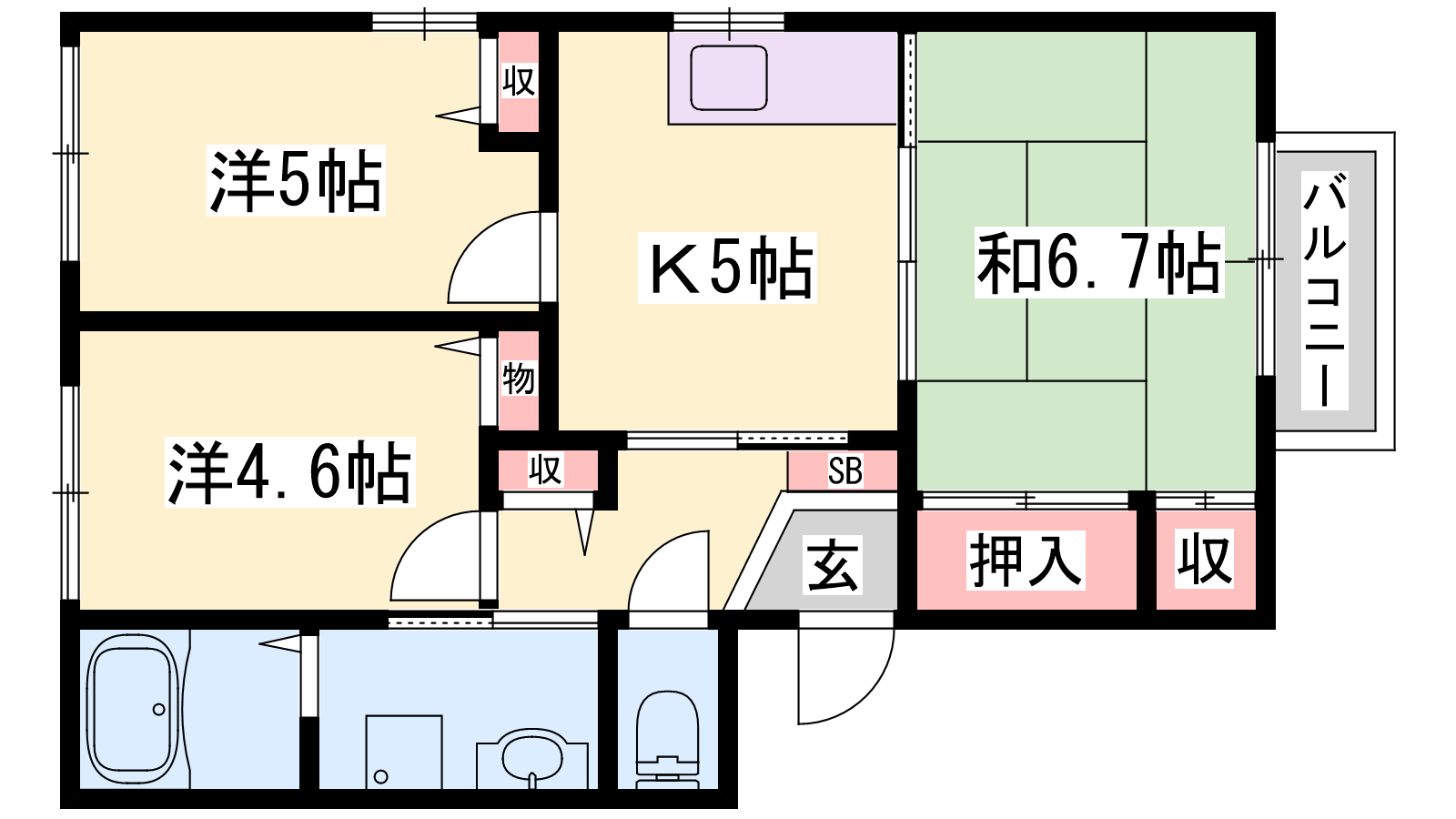 - K5帖、洋室5.5帖、洋室5帖、和室6.7帖