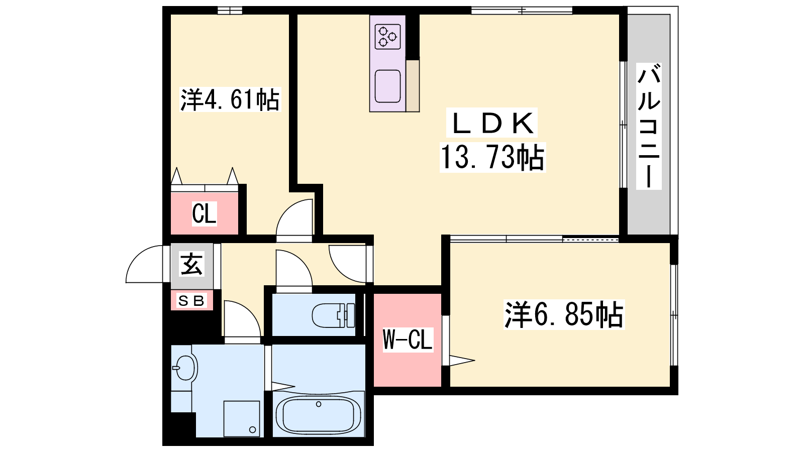 - LDK13.73帖、洋室6.85帖、洋室4.61帖