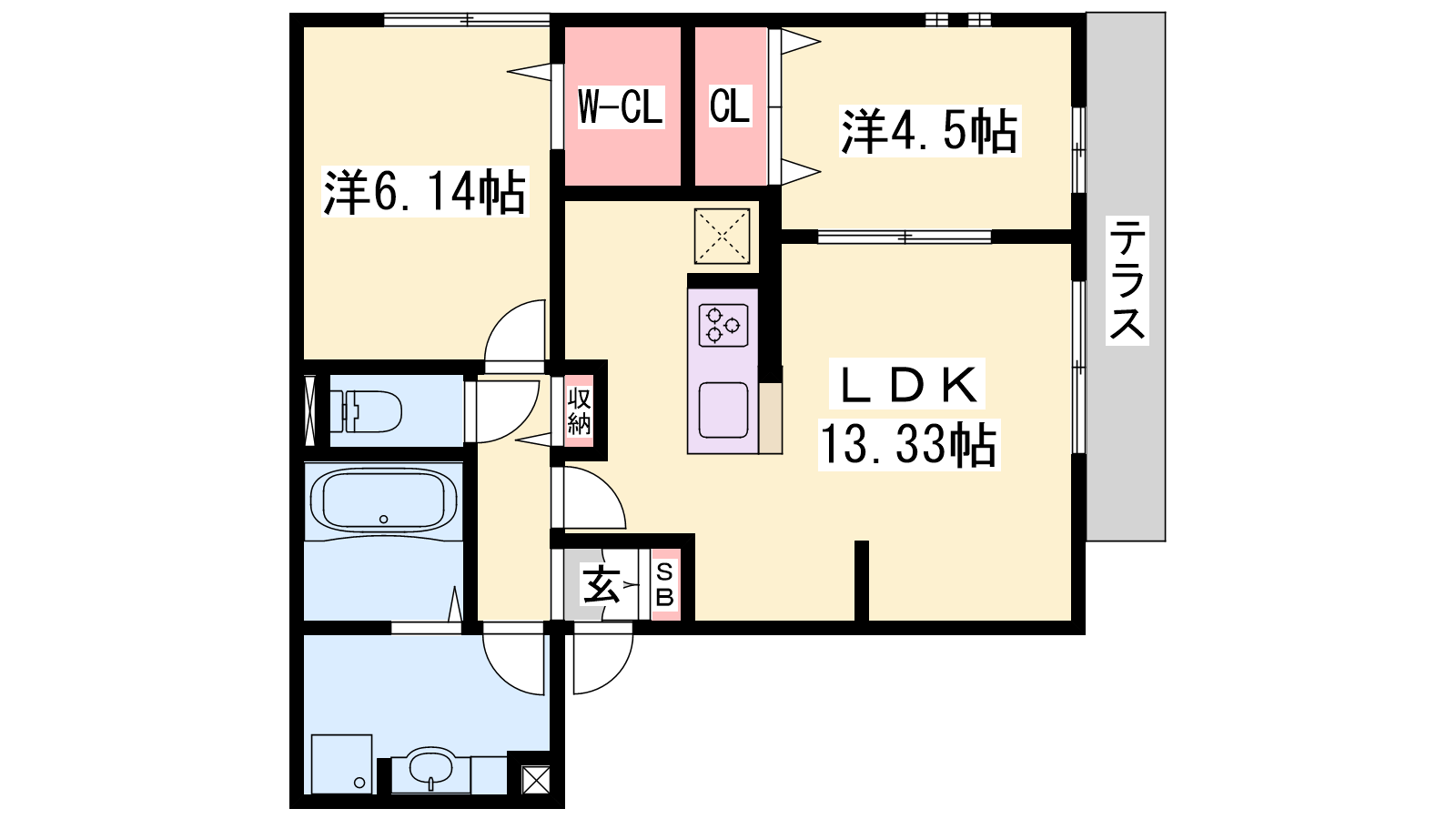 - LDK13.33帖、洋室6.14帖、洋室4.5帖