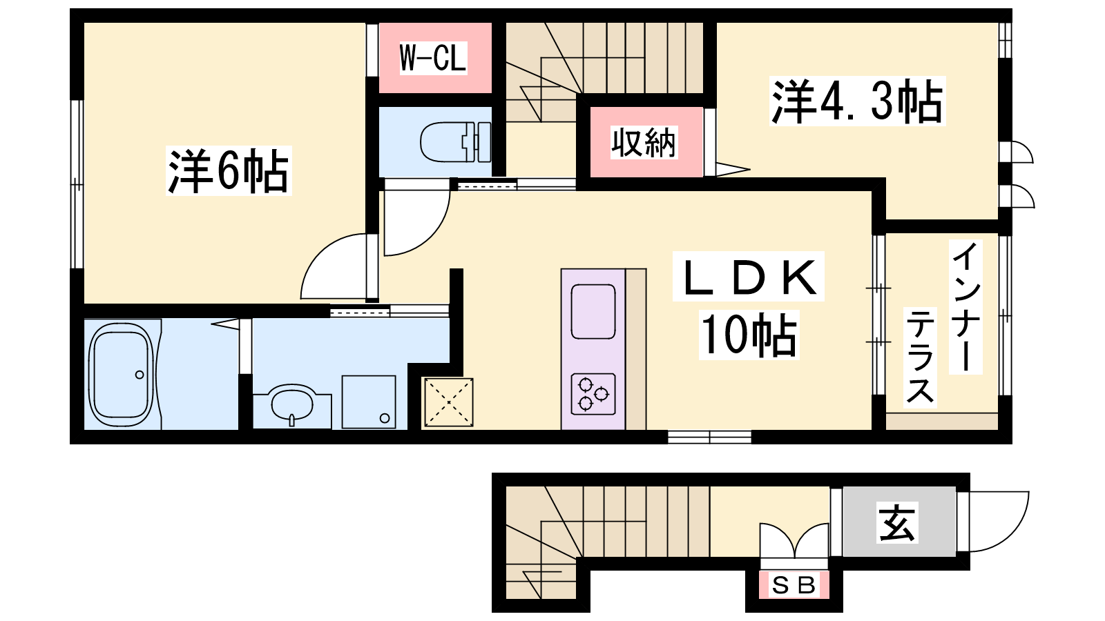 - LDK10帖、洋室6帖、洋室4.3帖