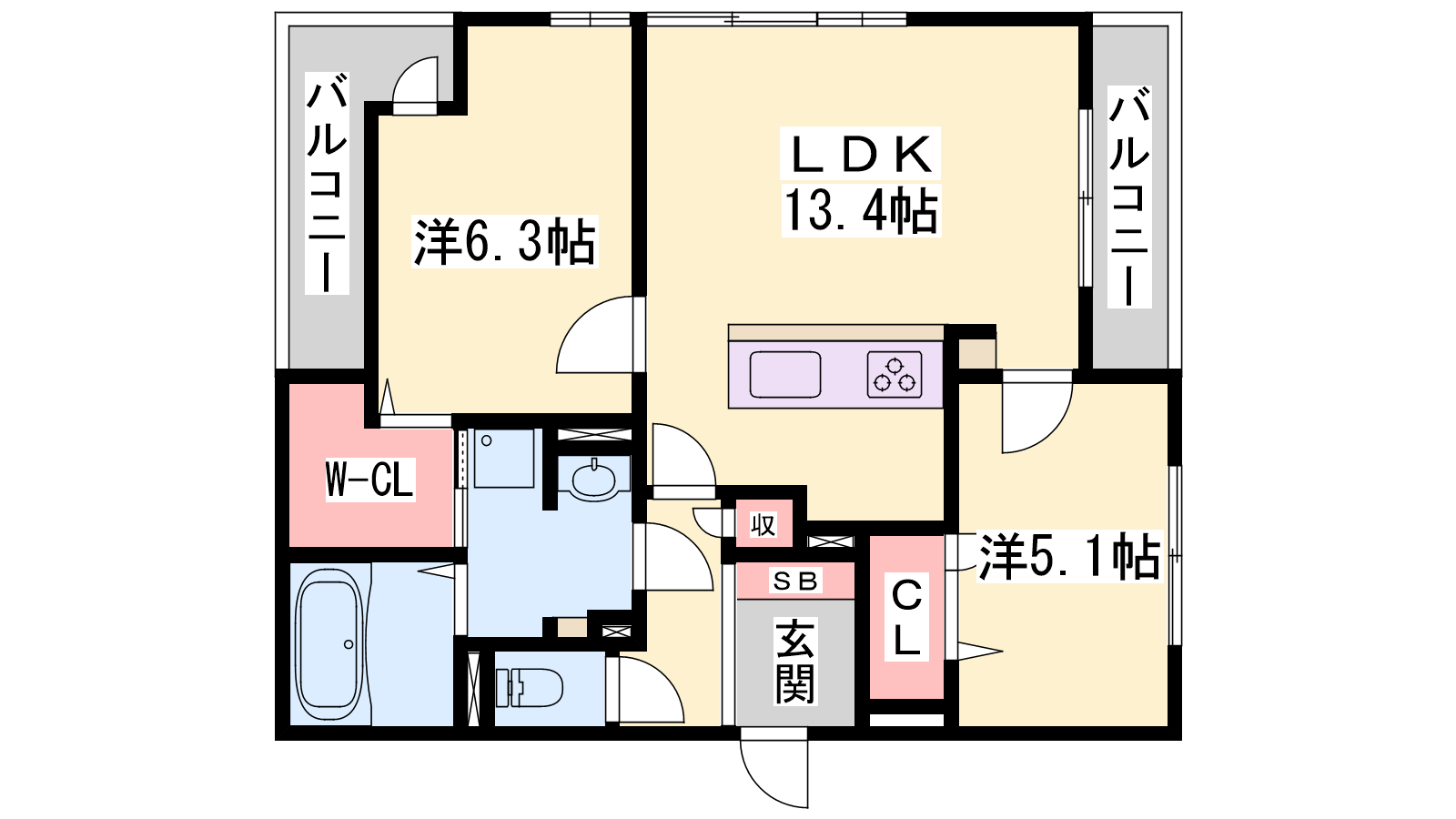 - LDK13.4帖、洋室6.3帖、洋室5.1帖