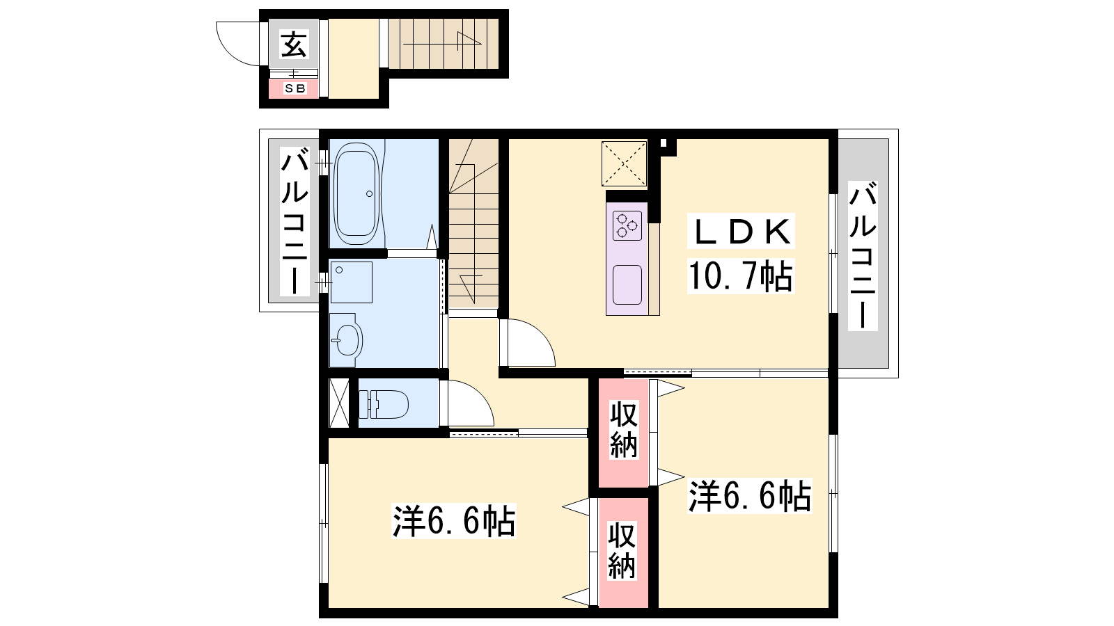 - LDK10.7帖、洋室6.6帖、洋室6.6帖