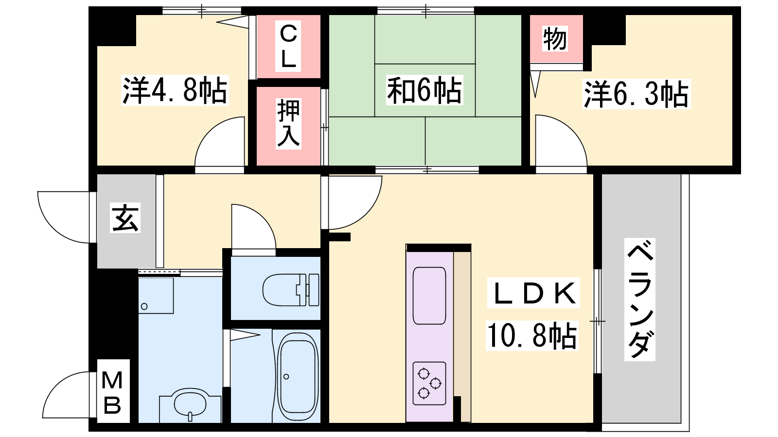 - LDK10.8帖、洋室6.3帖、洋室4.8帖、和室6帖