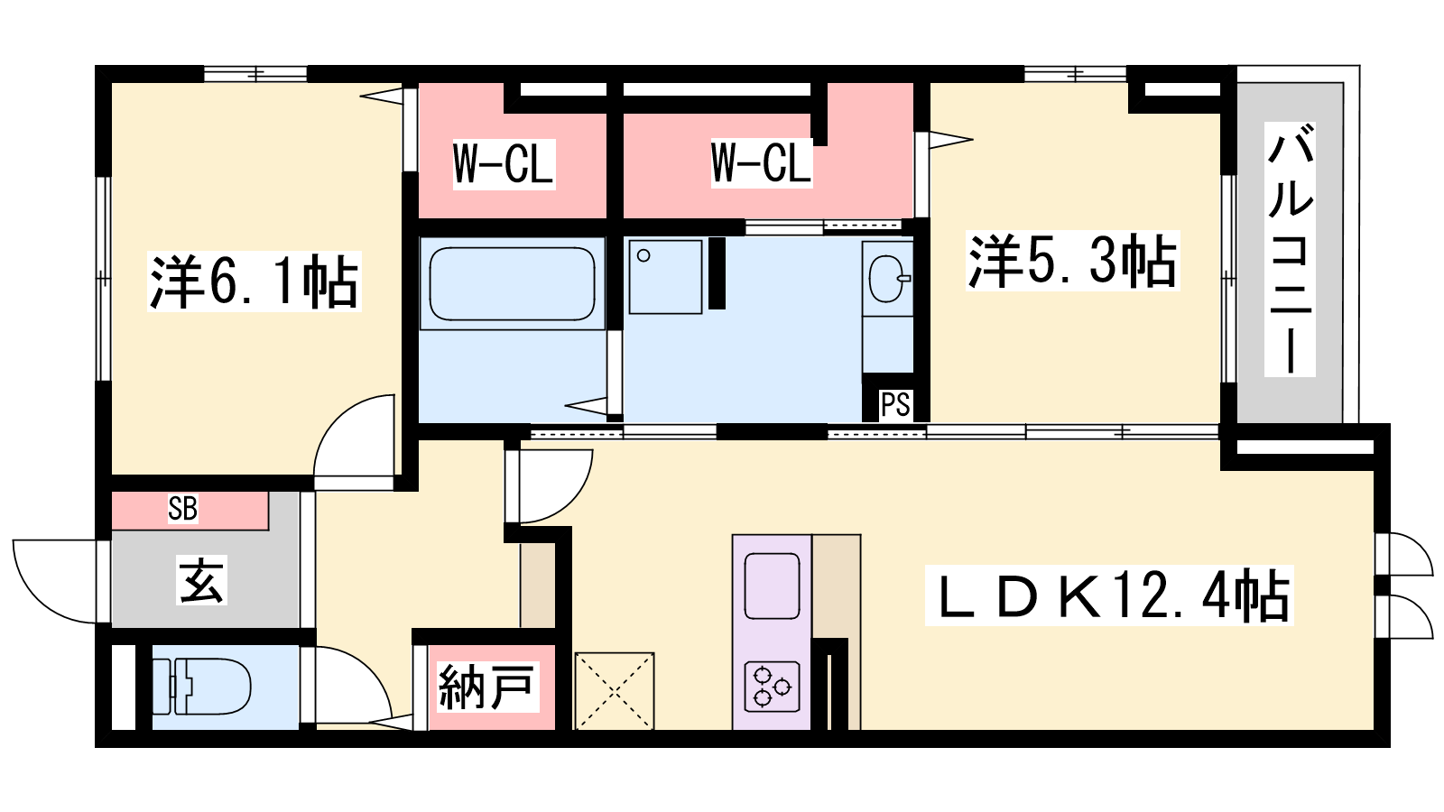 - LDK12.4帖、洋室6.1帖、洋室5.3帖