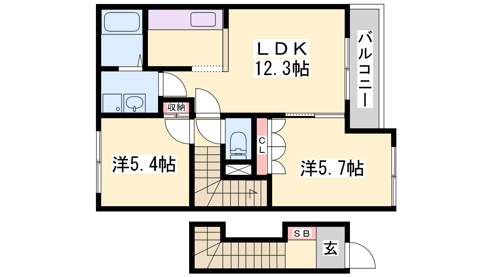 - LDK12.3帖、洋室5.7帖、洋室5.4帖