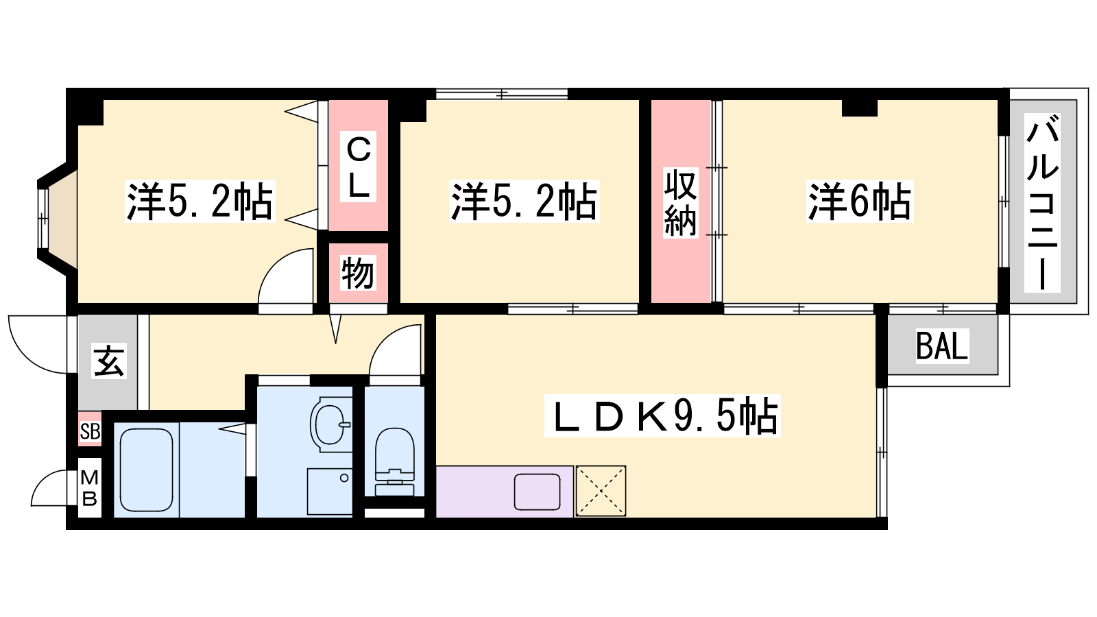 - LDK9.5帖、洋室6帖、洋室5.2帖、洋室5.2帖