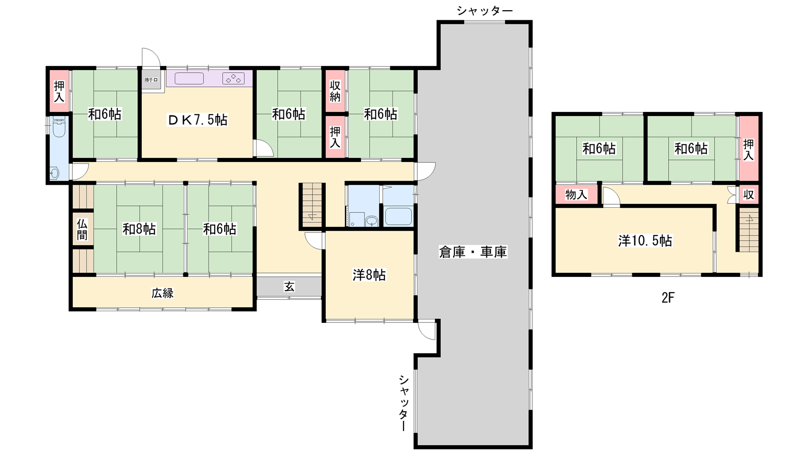 - DK7.5帖、和室8帖、和室6帖、和室6帖、和室6帖、和室6帖、和室6帖、和室6帖、洋室10.5帖、洋室8帖