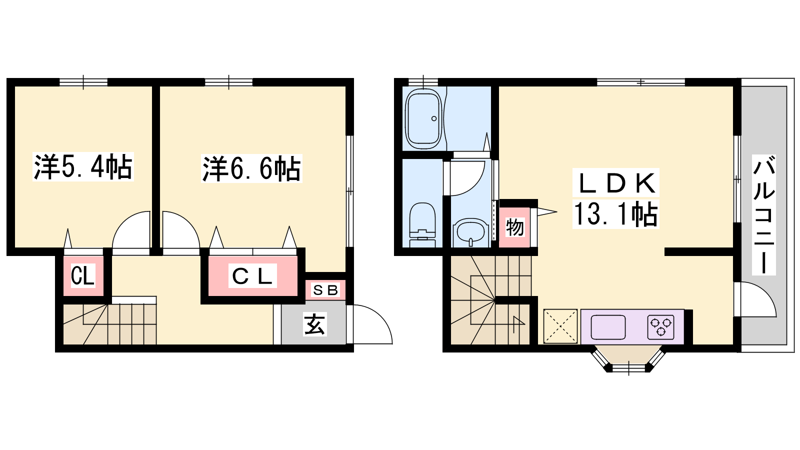- LDK13.1帖、洋室6.6帖、洋室5.4帖