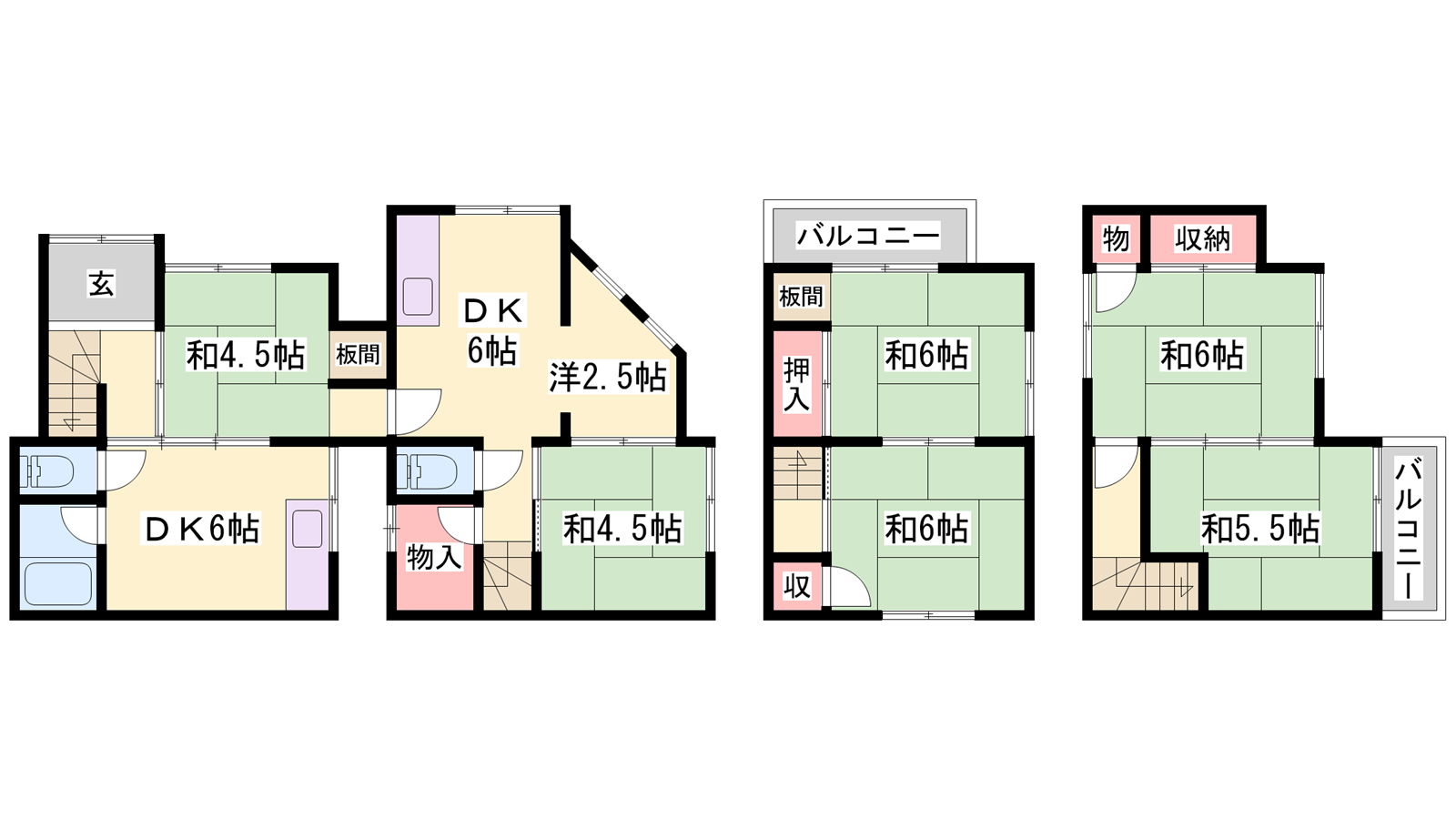 - DK6帖、DK6帖、和室6帖、和室6帖、和室6帖、和室5.5帖、和室4.5帖、和室4.5帖、洋室2.5帖