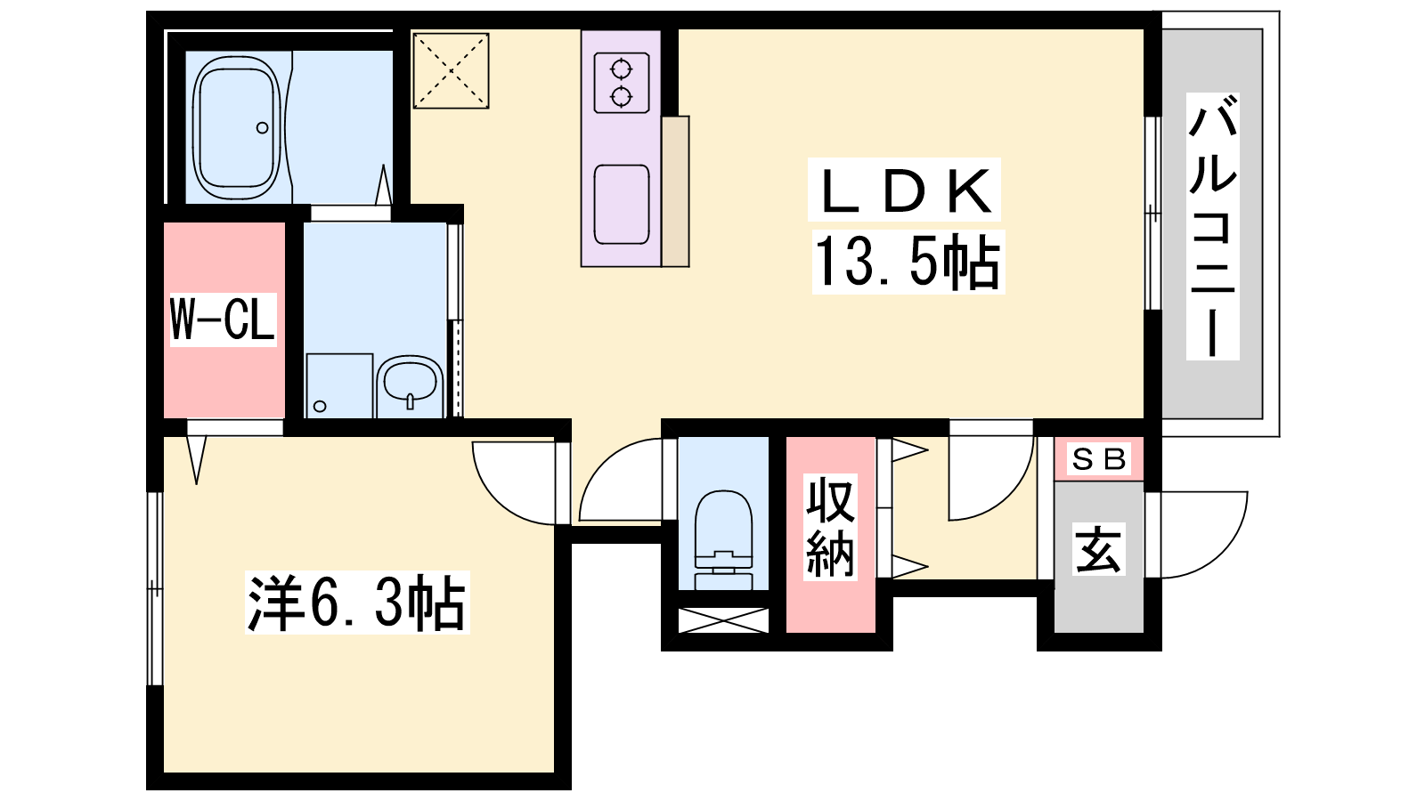 - LDK13.5帖、洋室6.3帖