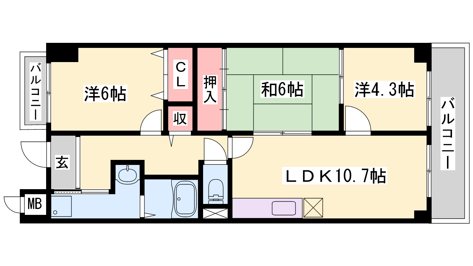 - LDK10.7帖、洋室6帖、洋室4.3帖、和室6帖