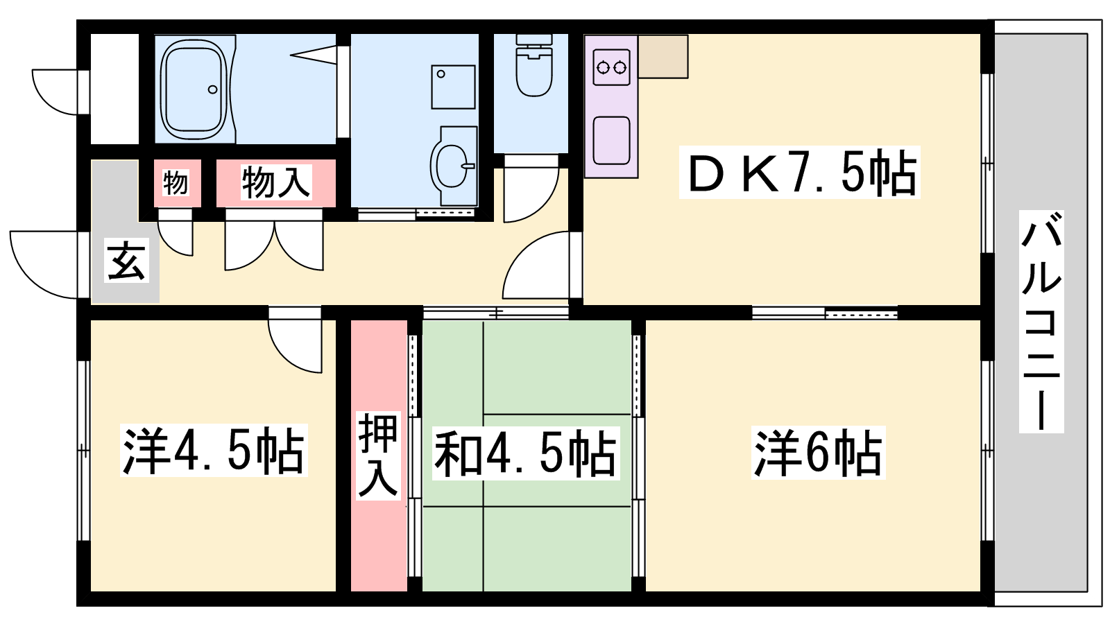 - DK7.5帖、洋室6帖、洋室4.5帖、和室4.5帖
