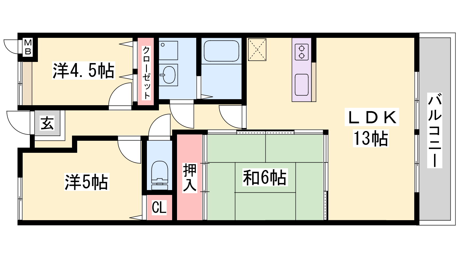 - LDK13帖、和室6帖、洋室5帖、洋室4.5帖