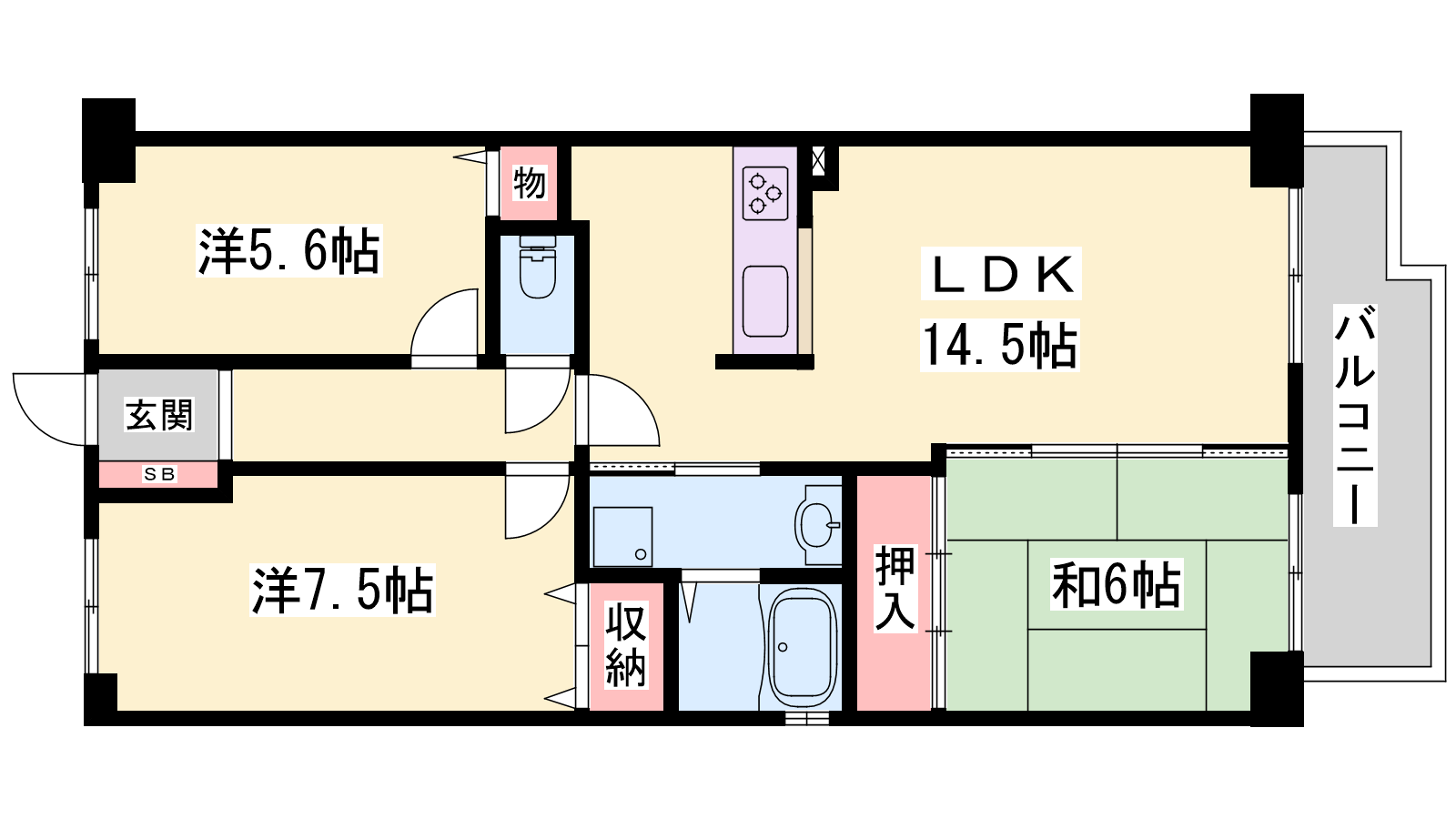 - LDK14.5帖、洋室7.5帖、洋室5.6帖、和室6帖